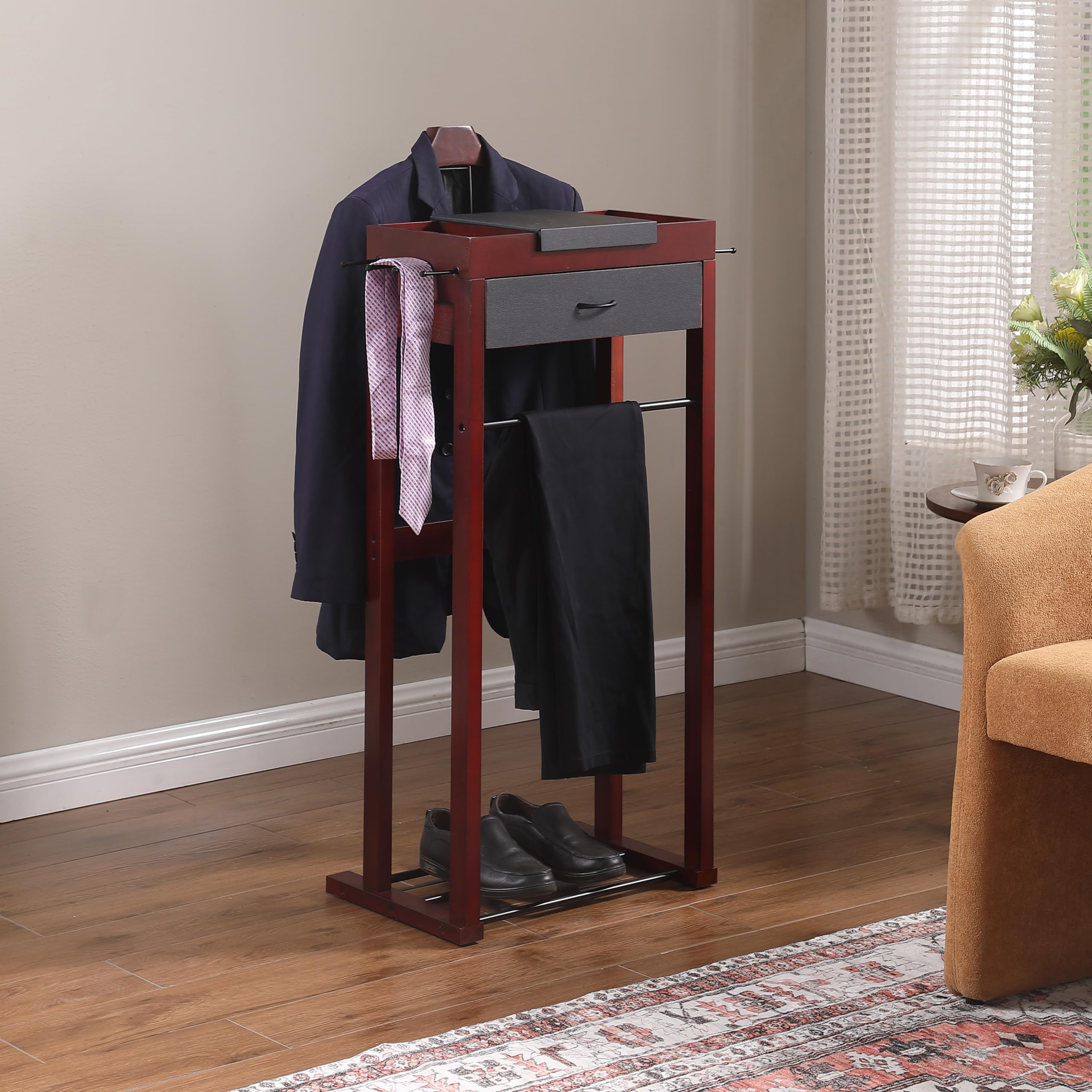 Proman Products Winston Freestanding Wooden Clothes Valet Stand Organizer with Hanger, Pant Rod, Drawer, Tie hook, Tray, Shoe Rack for men and women (Mahogany)